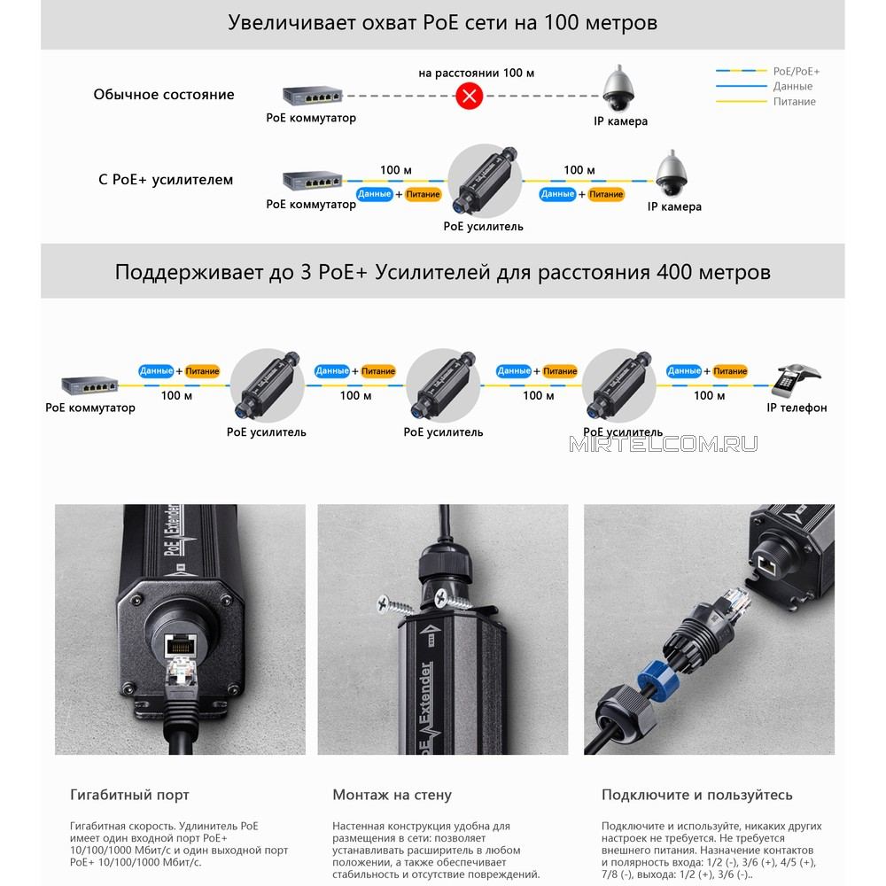 PoE удлинитель витой пары необходим для увеличения расстояния передачи данных в Ethernet сетях. Он усиливает сигнал на расстояние до 100 метров, т.е при использовании одного удлинителя суммарная длина линии может составлять до 200 метров.