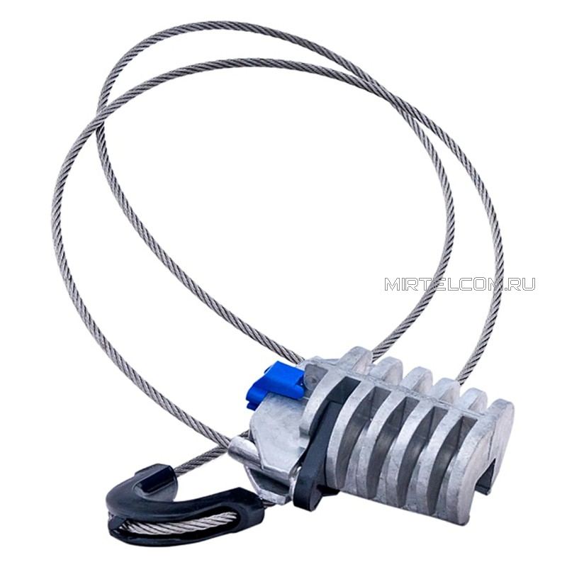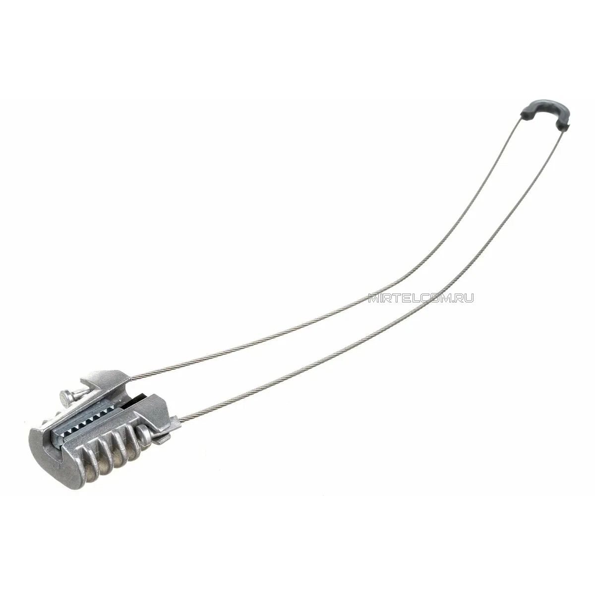 Используется для крепления на опорах кабель типа «8» за несущий трос, не оголяя и не отделяя его от кабеля. Все детали зажимов соединены между собой и не могут быть утеряны.